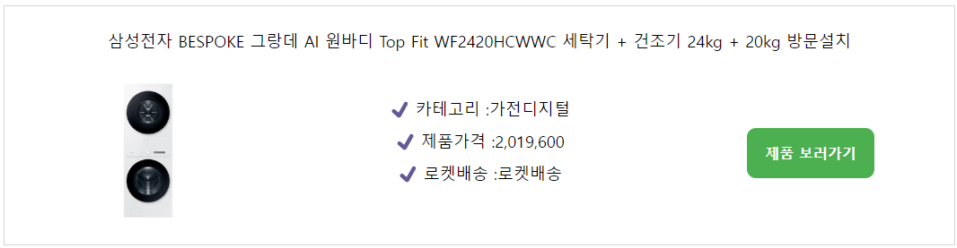 3. 삼성전자 BESPOKE 그랑데 AI 원바디 Top Fit WF2420HCWWC 세탁기 + 건조기 24kg + 20kg 방문설치