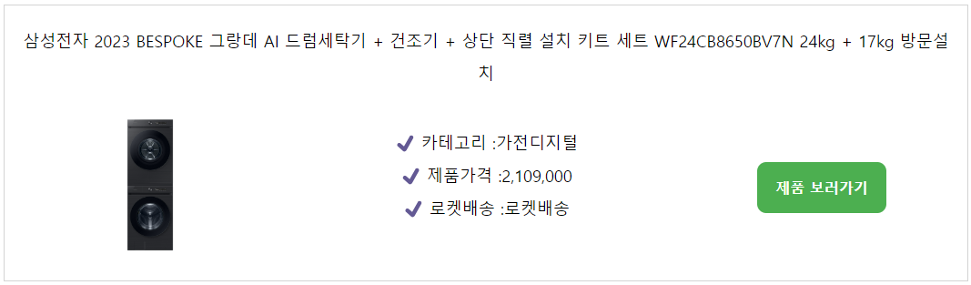 7. 삼성전자 2023 BESPOKE 그랑데 AI 드럼세탁기 + 건조기 + 상단 직렬 설치 키트 세트 WF24CB8650BV7N 24kg + 17kg 방문설치